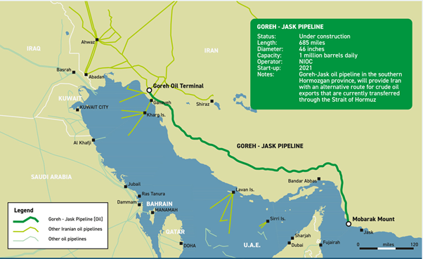 The crude oil transfer line from Goreh to jask , for the first time in the Iranian history ,enables the export of oil without the need to cross the strait of Hormuz.