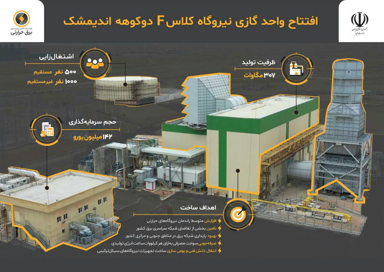The gas section of Dukohe class F power plant with capacity of 307 MW was officially inaugurated on 27/04/2023 with the presence of Islamic Republic of Iran president and Minister of Energy .