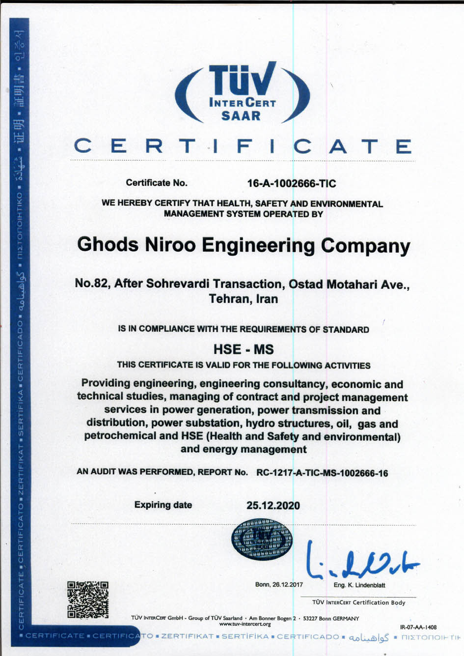 The certificate is valid for the providing engineering, engineering consultancy, economic and technical studies, managing of contract and project management services in power generation, power transmission and distribution, hydro structures, oil, gas and petrochemical and HSE (Health and safety and environmental) and energy management.